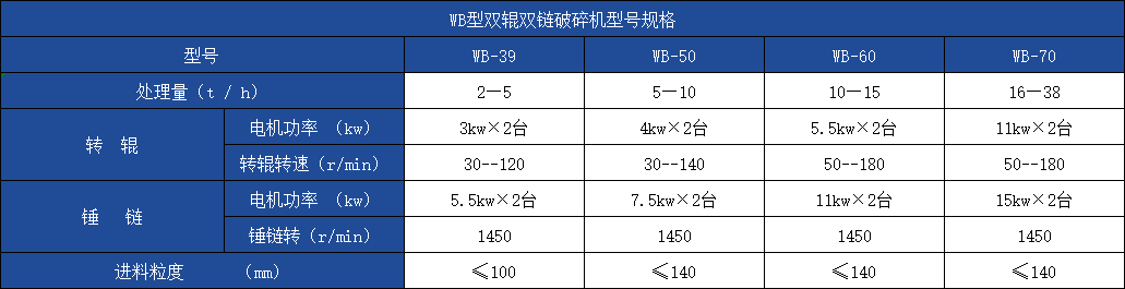 WB型双辊双链破碎机在上部加料,由二个相向旋转的辊轮先对物料内大小不匀的较大块物料进行挤压破碎,破碎后的物料被辊轮推出向下卸落,在辊轮下部有二个高速相向旋转的锤链对物料再进行冲击粉碎。该破碎机结构简单,能处理较大物料,且破碎比大、产品粒度均匀。适用于各种纯碱、化肥和其它中等硬度物料的粉碎。该机克服了生产使用中物料粘结于机壳内壁的缺点,使破碎操作连续化。